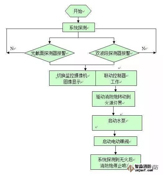 1)自動滅火方式 :火災探測部分的雙波段探測器或光截面探測器報警后,由具有較高空間定位精度的雙波段火災探測器對著火點位置進行定位,信息處理主機處理后將信號通知給自動消防水炮,驅動自動消防水炮進行空間掃描鎖定著火點,并將自動消防水炮自動指向火源點,延遲數(shù)秒后自動啟動消防水泵,自動開啟消防電動蝶閥進行噴射滅火。前端水流指示器反饋信號及水泵房壓力繼電器的開啟信號均在控制室操作臺上的顯示。主機結束警報時,自動(或者手動,手動優(yōu)先)關閉消防水泵及消防電動蝶閥。