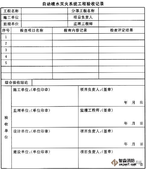 2、自動(dòng)噴水滅火系統(tǒng)工程驗(yàn)收應(yīng)按自動(dòng)噴水滅火系統(tǒng)工程驗(yàn)收記錄表填寫。