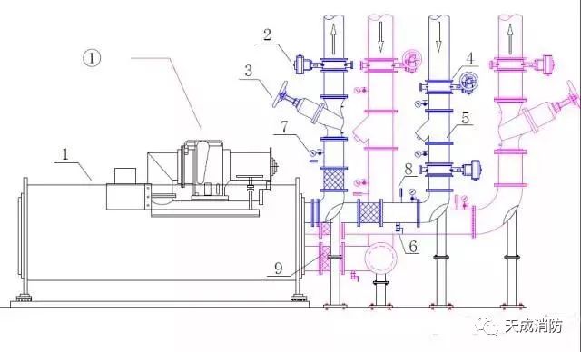 冷水機(jī)組常規(guī)接管圖:1-冷水機(jī)組,2-電動(dòng)閥,3-平衡閥,4-蝶閥,5-Y 型過濾器,6-泄水閥,7-壓力表,8-溫度計(jì),9-軟接頭。