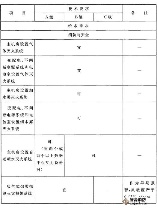 1、數(shù)據(jù)中心防火和滅火系統(tǒng)設(shè)計(jì)應(yīng)符合現(xiàn)行國家標(biāo)準(zhǔn)《建筑設(shè)計(jì)防火規(guī)范》GB 50016、《氣體滅火系統(tǒng)設(shè)計(jì)規(guī)范》GB 50370、《細(xì)水霧滅火系統(tǒng)技術(shù)規(guī)范》GB 50898和《自動(dòng)噴水滅火系統(tǒng)設(shè)計(jì)規(guī)范》GB 50084的規(guī)定,并應(yīng)按下表1的技術(shù)要求執(zhí)行。