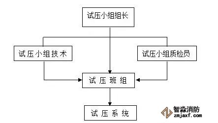 試壓時(shí)成立專門的試壓小組,試壓小組設(shè)組長(zhǎng)一人,試壓時(shí)聽從組長(zhǎng)指揮,試壓組織方塊圖如下: