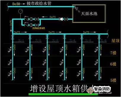 當市政管網的供水壓力夠大(能夠到達最高樓層)但是管徑偏小(小于De50)時,則可在樓頂增設屋頂冷水箱,市政管網接入屋頂冷水箱進行蓄水,在供水的主管道上安裝增壓水泵和變頻控制器,壓力控制以滿足最高樓層的供水壓力不小0.15MPa為準。