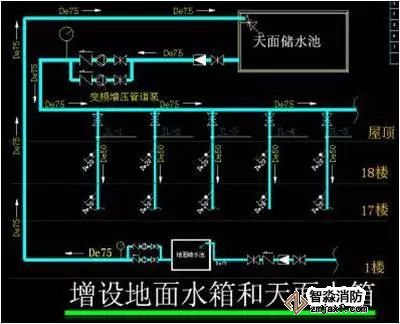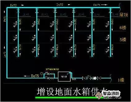 當市政管網的供水壓力不足時(無法直接到達最高樓層),則可在地面設置冷水箱,市政管網接入地面冷水箱進行蓄水,在供水的主管道上,安裝增壓水泵和變頻控制器,水壓的控制以滿足最高樓層的供水壓力不小于0.15MPa為準。