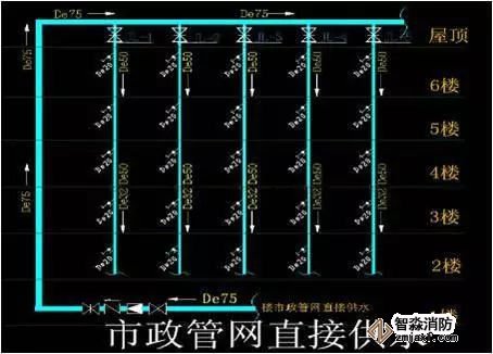 當市政供水管網接入到分店屋頂(或最高樓層,管徑De90以上),出水口的壓力能夠長期穩(wěn)定在0.15MPa以上時,則可采取此種方式直接供水。