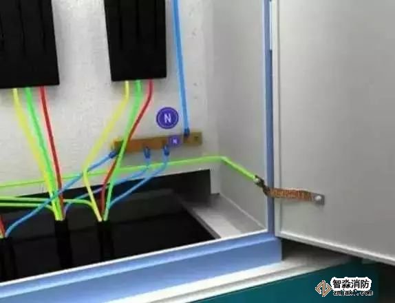 6、黃、綠、紅三相線分別從分配電箱的分路隔離開(kāi)關(guān)引出,從N板接線端子引出淡藍(lán)色的工作零線,從PE板接線端子引出黃綠雙色保護(hù)零線。