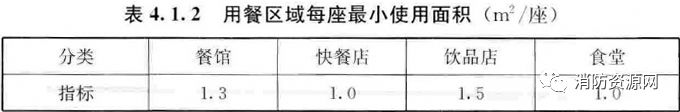 1、飲食或餐飲建筑可根據(jù)用餐區(qū)域的每座最小面積計(jì)算安全疏散人數(shù),用餐區(qū)域每座最小使用面積宜符合表4.1.2的規(guī)定。(4.1.2