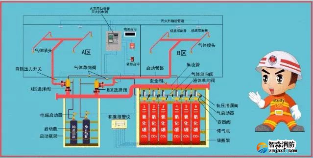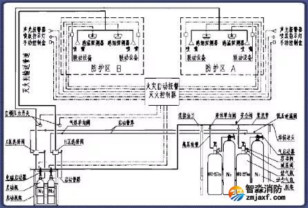 該系統(tǒng)由滅火劑瓶組、加壓氣體瓶組、驅(qū)動(dòng)氣體瓶組(可選)、單向閥、選擇閥、減壓裝置、驅(qū)動(dòng)裝置、集流管、連接管、噴頭、信號(hào)反饋裝置、安全泄放裝置、控制盤、檢漏裝置、管道管件及吊鉤支架等組成。