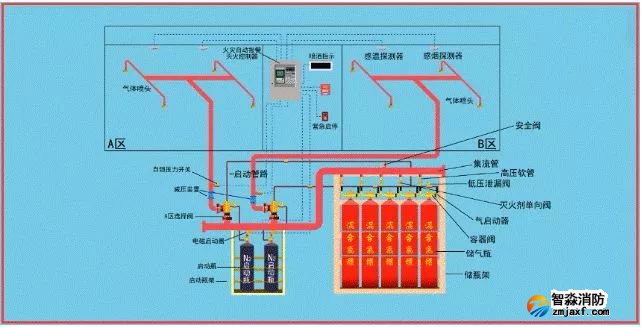 該系統(tǒng)由滅火劑儲(chǔ)存裝置、總控閥、驅(qū)動(dòng)器、噴頭、管道超壓泄放裝置、信號(hào)反饋裝置、控制器等組成。
