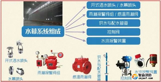 水幕系統(tǒng)由開式灑水噴頭或水幕噴頭、雨淋報(bào)警閥組或感溫雨淋閥、供水與配水管道、控制閥以及水流報(bào)警裝置(水流指示器或壓力開關(guān))等組成。