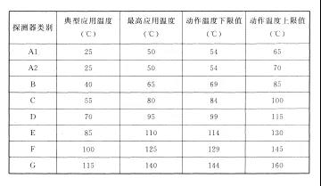 注:表中A1、A2、B、C、D、E、F、G為點(diǎn)型感溫探測器的不同類別,其具體參數(shù)應(yīng)符合附錄一的規(guī)定。