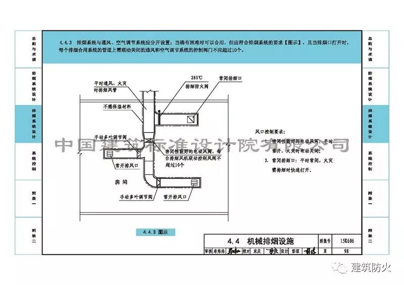 4、第98頁的“4.4.3圖示”中排煙支管上增加了“280℃排煙防火閥”,刪除了“風(fēng)口控制要求”中“常閉排煙口”280℃自動(dòng)關(guān)閉的字樣。