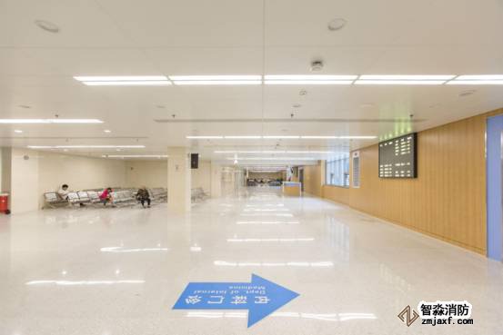 診室候診區(qū)燈具、噴頭、風(fēng)口、煙感排布精細(xì)美觀,橫成排、豎成行、斜成線,錯落有致。