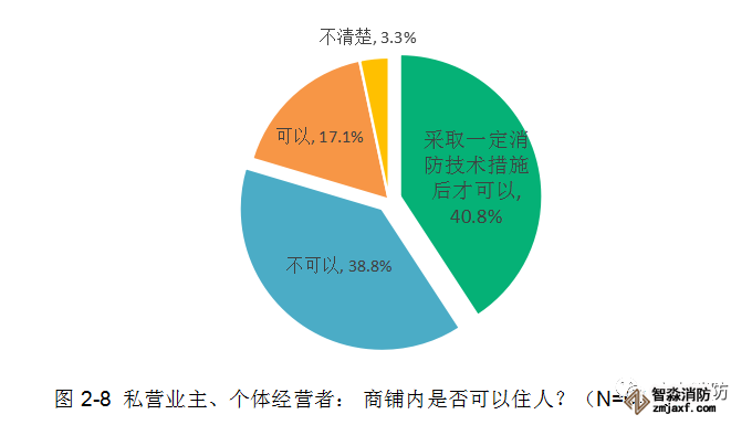 今年,廣東消防針對我省私營業(yè)主和個體經(jīng)營者展開調(diào)查的數(shù)據(jù)顯示,有79.6%的受訪者對于“商鋪內(nèi)是否可以住人”這一消防知識有一定正確認知:38.8%的受訪者明確表示商鋪內(nèi)不可以住人,約40.8%的受訪者表示采取一定消防技術(shù)措施后才可以住人,但仍有17.1%的受訪者存在錯誤觀念,認為商鋪內(nèi)可以直接居住。
