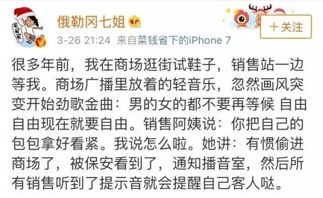 帖子說的是,微博網(wǎng)友發(fā)帖稱,逛商場時,如果商場的背景音樂畫風(fēng)突變,這有可能是商場發(fā)現(xiàn)有小偷“來訪”的警告!