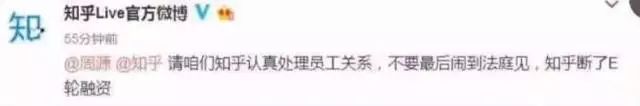 9日,知乎Live官方發(fā)微博稱,“請知乎認真處理員工關(guān)系,不要最后鬧到法庭見,知乎斷了E輪融資”,并艾特了知乎創(chuàng)始人周源。據(jù)此前該賬號發(fā)布的消息顯示,該離職員工投訴對象為其直接領(lǐng)導(dǎo)孟珊。該員工稱,孟珊在知乎帶領(lǐng)只是市場Live微信生態(tài)期間,管理霸蠻,工作安排不公平。知乎方面表示,是知乎離職員工盜取了官方微博賬號密碼發(fā)送了該則消息。目前,該賬號發(fā)布的相關(guān)內(nèi)容已被刪除。