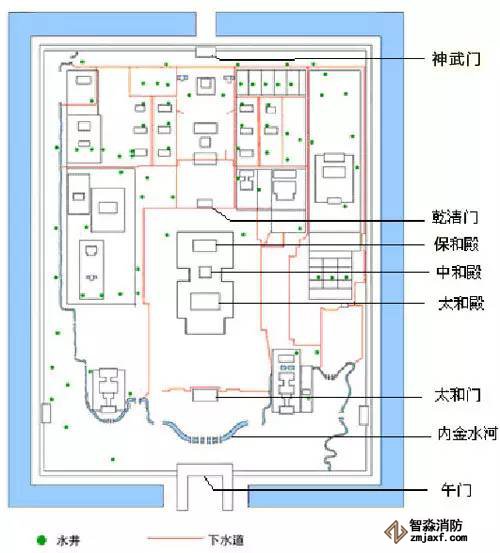紫禁城排水系統(tǒng)總體規(guī)劃是東西方向的雨水匯入南北干溝,然后流入內(nèi)金水河。各個宮殿院落均設(shè)有干溝、支溝、明溝、暗溝、涵洞、流水溝眼等眾多排水設(shè)施。