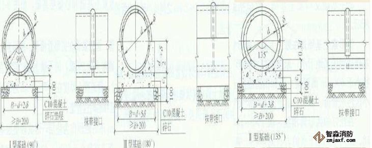 混凝土帶形基礎(chǔ)楚沿管道全長(zhǎng)鋪設(shè)的基礎(chǔ),分為90、135、180的管座形式。