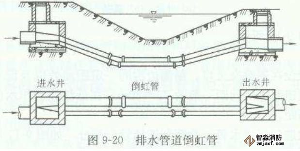 排水管道遇到河流、洼地、或地下構(gòu)筑物等障礙物時(shí),不能按原有的坡度埋設(shè),而是按凹的折線方式從障礙物下通過(guò),這種管道稱為倒虹管。它由進(jìn)水井、下行管、平行管、上行管和出水井組成。