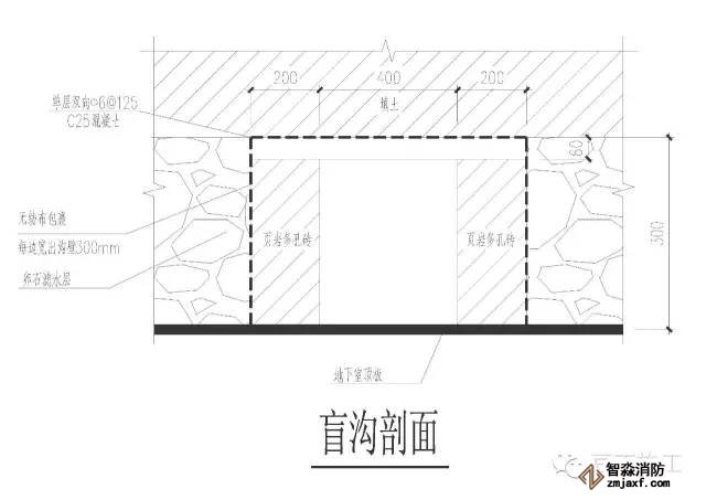 5、在地下室周邊設(shè)置與場(chǎng)地內(nèi)盲溝相連的排水通道,最終將水排入城市雨