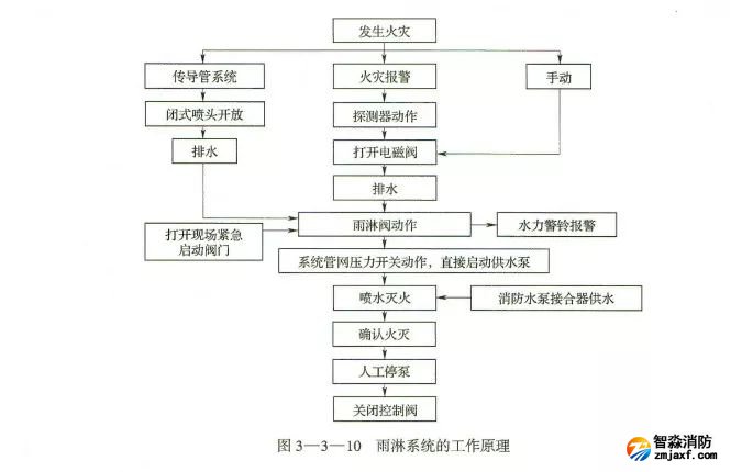 組成:火災探測傳動控制系統(tǒng)、自動控制成組作用閥門系統(tǒng)、帶開式噴頭的自動噴水滅火系統(tǒng)。