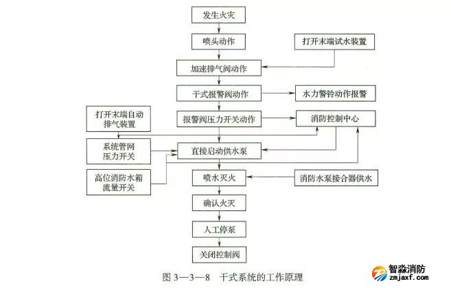 生火災時,由火災自動報警系統(tǒng)開啟預作用報警閥的電磁閥,配水管道開始排氣充水,使系統(tǒng)在閉式噴頭動作前轉換成濕式系統(tǒng),系統(tǒng)管網的壓力開關或高位消防水箱的流量開關直接啟動消防水泵并在閉式噴頭開啟后立即噴水。