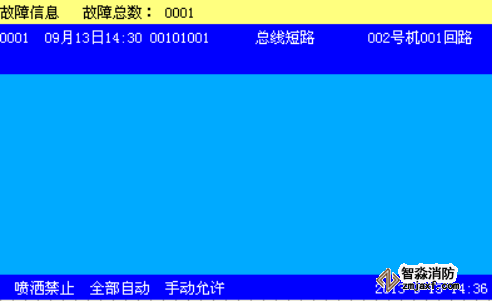 消防報警系統(tǒng)某個回路總線發(fā)生短路、線間電流過大時,控制器發(fā)出聲、光報警,同時在液晶屏上以中文顯示總線短路(見下圖),打印機、歷史記錄記錄相應的故障信息。