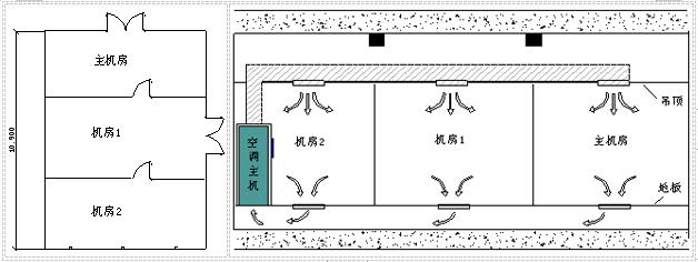 如下圖所示,若三個(gè)房間從吊頂?shù)降匕宥疾捎锚?dú)立的空調(diào)系統(tǒng),那么將機(jī)房1和機(jī)房2劃作一個(gè)區(qū)域或劃為兩個(gè)單獨(dú)滅火區(qū)都是可行的。但如果采用一臺(tái)精密空調(diào)為三個(gè)房間服務(wù)且為“上送風(fēng),地板下回風(fēng)”方式這三個(gè)房間就必須劃分成一個(gè)滅火區(qū)域,藥劑儲(chǔ)備應(yīng)該是上者的3倍或1.5倍,對(duì)工程的投資影響是比較大的。除過滅火劑和噴放管道布置要作為一個(gè)保護(hù)區(qū)考慮外,探測(cè)范圍也應(yīng)該分塊進(jìn)行探測(cè)但還是一個(gè)探測(cè)區(qū)域,警報(bào)區(qū)域也應(yīng)該按照一個(gè)區(qū)域來(lái)設(shè)置和聯(lián)動(dòng)。