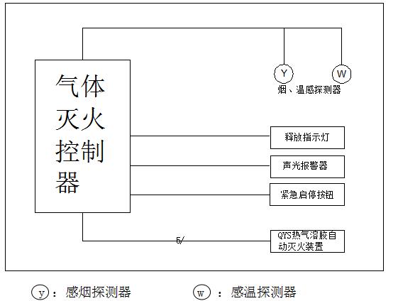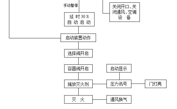 發(fā)生火災(zāi)時(shí),當(dāng)一路探測(cè)器報(bào)警后,設(shè)在該防護(hù)區(qū)域內(nèi)的警鈴動(dòng)作;兩路探測(cè)器都報(bào)警后,設(shè)在該防護(hù)區(qū)域內(nèi)外的蜂鳴器及閃燈動(dòng)作;系統(tǒng)進(jìn)入延時(shí)階段,控制盤完成相關(guān)設(shè)備的聯(lián)動(dòng)控制。經(jīng)過延時(shí)后,控制盤輸出24V直流信號(hào)電源啟動(dòng)儲(chǔ)氣瓶組上的電磁閥,打開儲(chǔ)氣瓶組釋放滅火劑氣體,滅火劑沿噴射短管和噴頭輸送到防護(hù)區(qū)域滅火。如值班人員先于火災(zāi)探測(cè)系統(tǒng)發(fā)現(xiàn)火情,當(dāng)用手提式滅火器或其它移動(dòng)式滅火設(shè)備無(wú)法撲滅火災(zāi)時(shí),可直接手動(dòng)啟動(dòng)來(lái)滅火。如發(fā)現(xiàn)是系統(tǒng)誤動(dòng)作,或確有火災(zāi)發(fā)生但僅使用手提式滅火器和其它移動(dòng)式滅火設(shè)備即可撲滅火災(zāi),可按下設(shè)在防護(hù)區(qū)域門外的緊急止噴按鈕,可以使系統(tǒng)暫時(shí)停止釋放藥劑。如需繼續(xù)開啟氣體滅火系統(tǒng),則只需松開緊急停止開關(guān)即可。