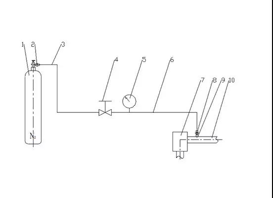 (2)試驗(yàn)前應(yīng)先進(jìn)行預(yù)試驗(yàn),先將針型閥打開,再緩慢打開氮?dú)馄?,同時(shí)觀察壓力表5的變化情況,當(dāng)壓力值上升到0.2MPa時(shí),關(guān)閉氮?dú)馄亢歪樞烷y,檢查每個(gè)焊接處與螺紋接口處是否有泄漏,如有泄漏,應(yīng)修復(fù)后方可繼續(xù)向管道內(nèi)充氣試壓。